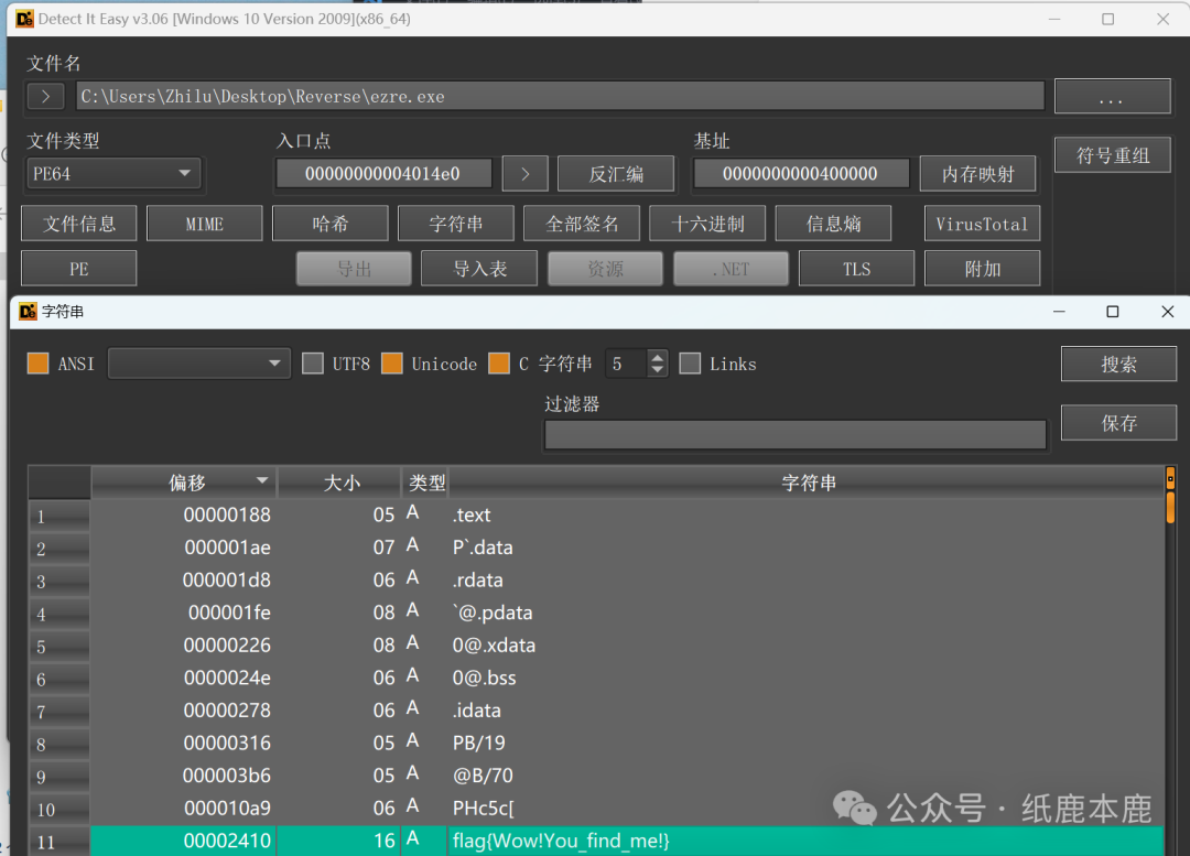 使用DIE的字符串浏览,得到 flag{Wow!You_find_me!}。