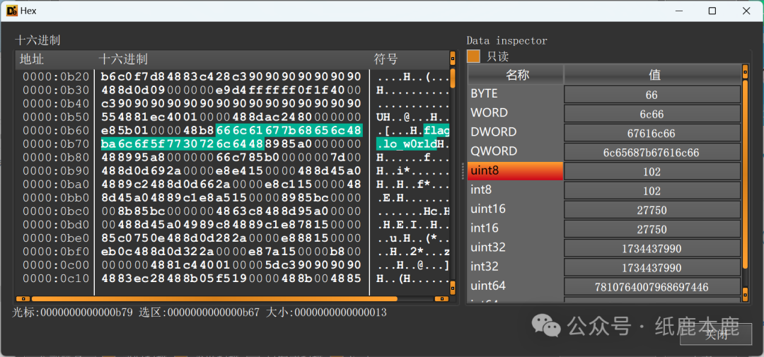 使用十六进制浏览,碰巧翻到这里,删去无效字符后得到 flag{hello_w0rld}。