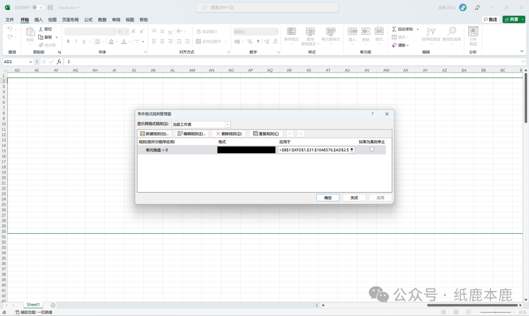打算使用条件格式将 1 显示为黑色,发现条件格式里已经给出了 Hint,将其修改到正确的区域。