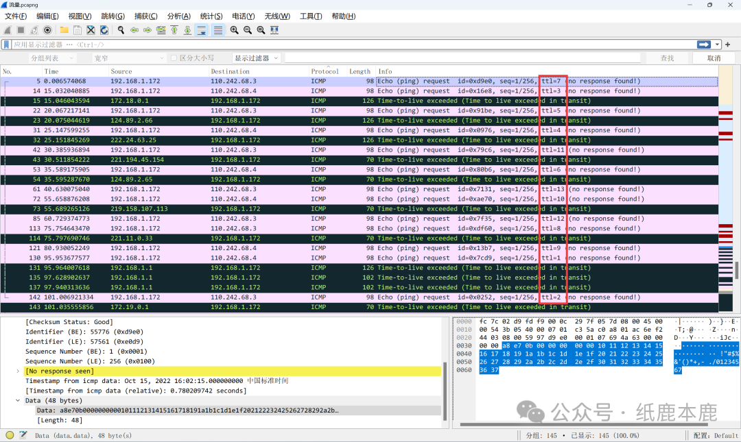 使用Wireshark打开下载的流量文件,根据提示,乱序flag的顺序就藏在流量中,筛选出ping命令,发现TTL值与1~13一一对应。
